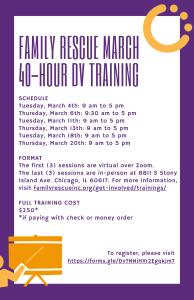 Family Rescue if offering their next 40 Hour Domestic Violence Training in the 20hrs virtual/ 20hrs in-person format. The training will be Tuesdays and Thursdays, March 4th through March 20th during traditional work hours. The first 3 sessions will be facilitated over Zoom and the last 3 sessions will be facilitated in person at our administration office at 8811 S Stony Island Ave. Chicago, IL 60617. Interested participants can register at https://forms.gle/6LhYdMEpybCiDkUQ6